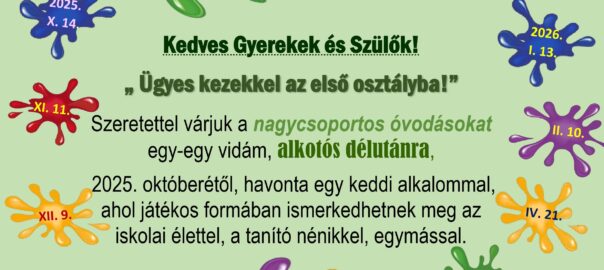 Kedves Szülők! Szeretettel várjuk az iskolánk iránt érdeklődő szülőket, gyermekeikkel együtt az OKTÓBERTŐL induló „ALKOTÓ KALAND” -ÜGYES KEZEKKEL AZ ELSŐ OSZTÁLYBA” című KÉZMŰVES iskola-előkészítő foglalkozásokra. Az „ügyes kezű” foglalkozásokat Andi néni, GyörgyiTovábbi információ…